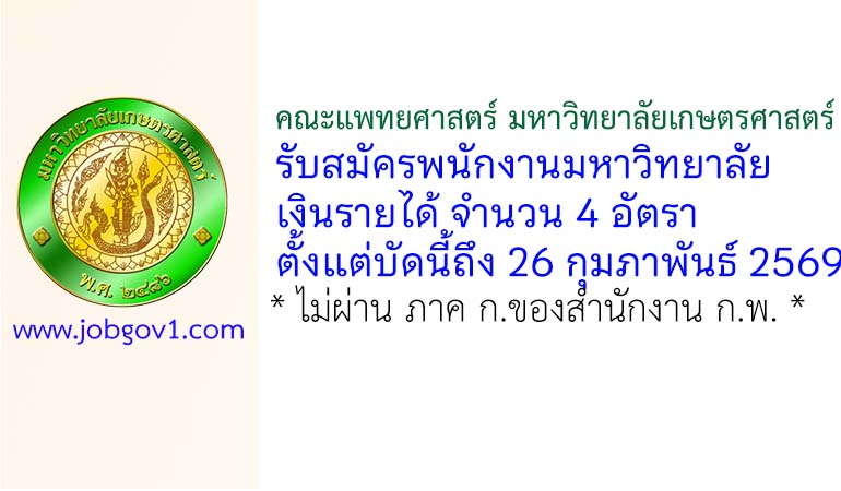 คณะแพทยศาสตร์ มหาวิทยาลัยเกษตรศาสตร์ รับสมัครพนักงานมหาวิทยาลัยเงินรายได้ 4 อัตรา ตั้งแต่บัดนี้ถึง 26 กุมภาพันธ์ 2569