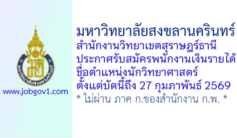 มหาวิทยาลัยสงขลานครินทร์ วิทยาเขตสุราษฎร์ธานี รับสมัครพนักงานเงินรายได้ ตำแหน่งนักวิทยาศาสตร์ ตั้งแต่บัดนี้ ถึง 27 กุมภาพันธ์ 2569
