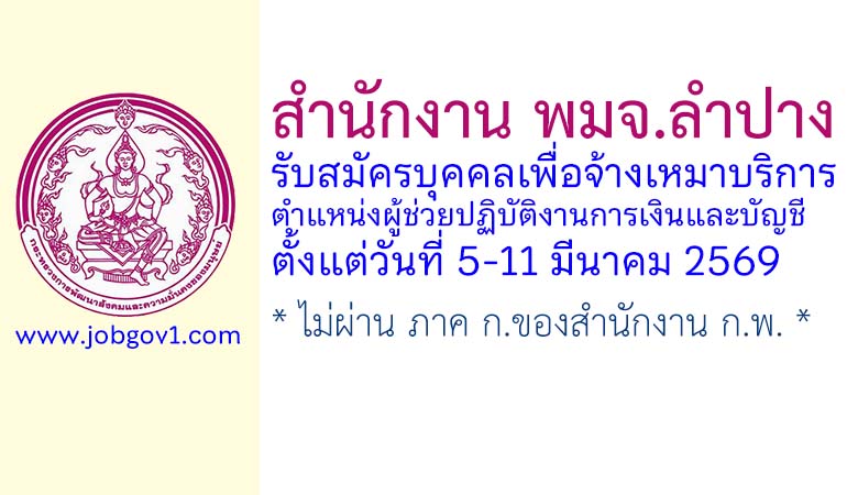 สำนักงาน พมจ.ลำปาง รับสมัครบุคคลเพื่อจ้างเหมาบริการ ตำแหน่งผู้ช่วยปฏิบัติงานการเงินและบัญชี ตั้งแต่วันที่ 5-11 มีนาคม 2569