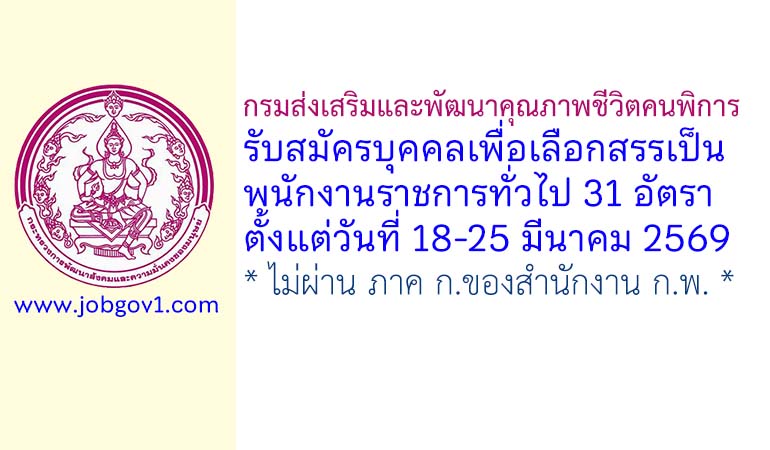 กรมส่งเสริมและพัฒนาคุณภาพชีวิตคนพิการ รับสมัครบุคคลเพื่อเลือกสรรเป็นพนักงานราชการทั่วไป 31 อัตรา ตั้งแต่วันที่ 18-25 มีนาคม 2569