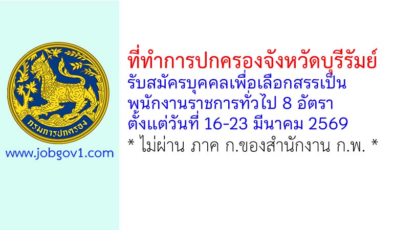 ที่ทำการปกครองจังหวัดบุรีรัมย์ รับสมัครบุคคลเพื่อเลือกสรรเป็นพนักงานราชการทั่วไป 8 อัตรา ตั้งแต่วันที่ 16-23 มีนาคม 2569