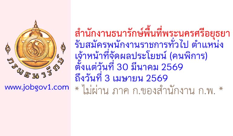 สำนักงานธนารักษ์พื้นที่พระนครศรีอยุธยา รับสมัครพนักงานราชการทั่วไป ตำแหน่งเจ้าหน้าที่จัดผลประโยชน์ (คนพิการ) ตั้งแต่วันที่ 30 มีนาคม 2569 ถึงวันที่ 3 เมษายน 2569