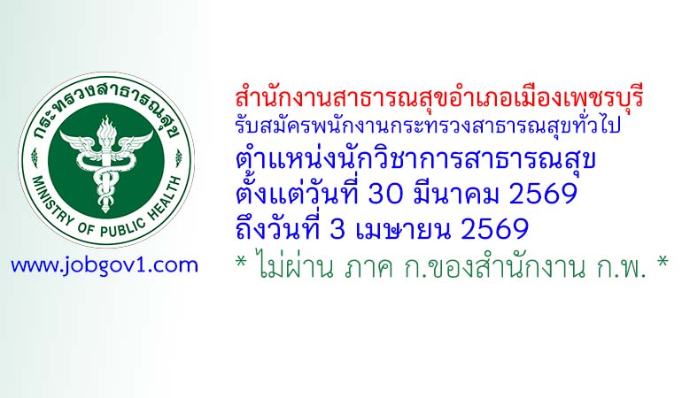 สำนักงานสาธารณสุขอำเภอเมืองเพชรบุรี รับสมัครพนักงานกระทรวงสาธารณสุขทั่วไป ตำแหน่งนักวิชาการสาธารณสุข ตั้งแต่วันที่ 30 มีนาคม 2569 ถึงวันที่ 3 เมษายน 2569