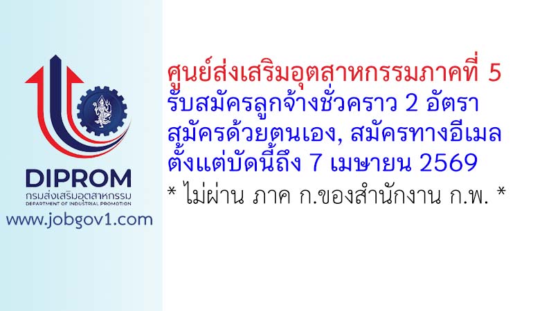 ประกาศศูนย์ส่งเสริมอุตสาหกรรมภาคที่ 5 เรื่อง รับสมัครคัดเลือกบุคคลเข้ารับราชการเป็นลูกจ้างชั่วคราว ตำแหน่งนิติกร และตำแหน่งเจ้าหน้าที่วิเคราะห์โครงการ