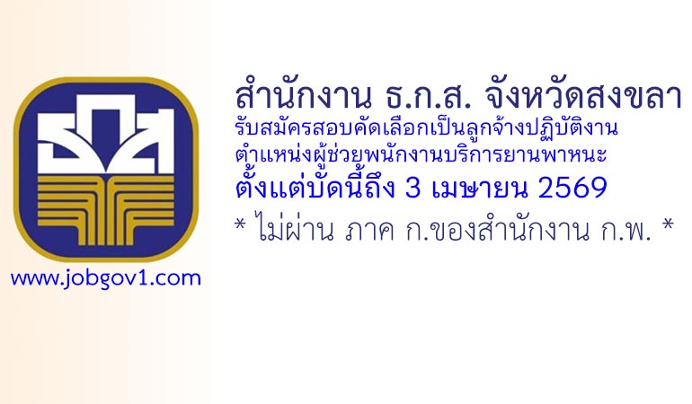 สำนักงาน ธ.ก.ส. จังหวัดสงขลา รับสมัครสอบคัดเลือกเป็นลูกจ้างปฏิบัติงาน ตำแหน่งผู้ช่วยพนักงานบริการยานพาหนะ ตั้งแต่บัดนี้ถึง 3 เมษายน 2569