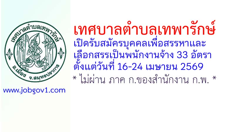 เทศบาลตำบลเทพารักษ์ รับสมัครบุคคลเพื่อสรรหาและเลือกสรรเป็นพนักงานจ้าง 33 อัตรา ตั้งแต่วันที่ 16-24 เมษายน 2569