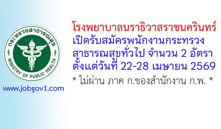 โรงพยาบาลนราธิวาสราชนครินทร์ รับสมัครพนักงานกระทรวงสาธารณสุขทั่วไป 2 อัตรา ตั้งแต่วันที่ 22-28 เมษายน 2569