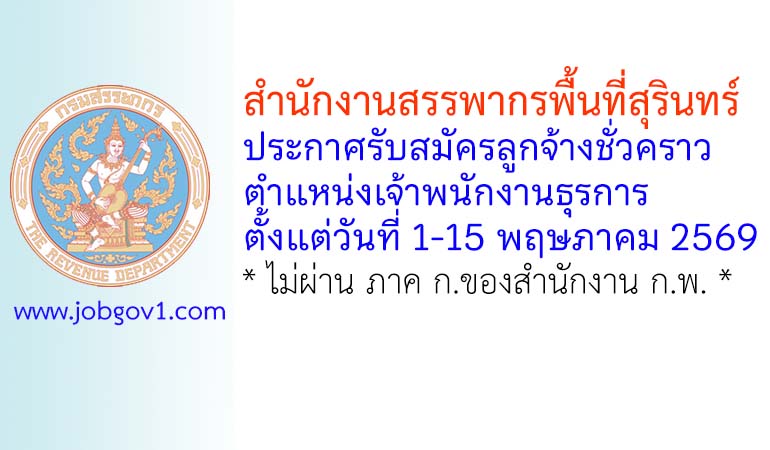 สำนักงานสรรพากรพื้นที่สุรินทร์ รับสมัครลูกจ้างชั่วคราว ตำแหน่งเจ้าพนักงานธุรการ ตั้งแต่วันที่ 1-15 พฤษภาคม 2569