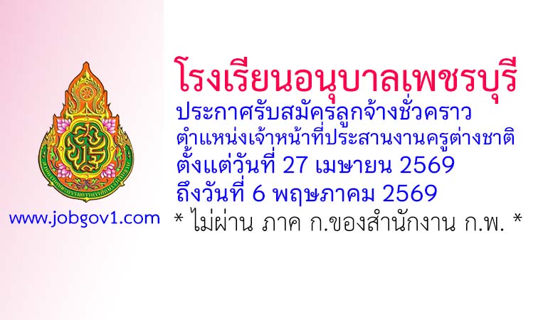 โรงเรียนอนุบาลเพชรบุรี รับสมัครลูกจ้างชั่วคราว ตำแหน่งเจ้าหน้าที่ประสานงานครูต่างชาติ ตั้งแต่วันที่ 27 เมษายน 2569 ถึงวันที่ 6 พฤษภาคม 2569
