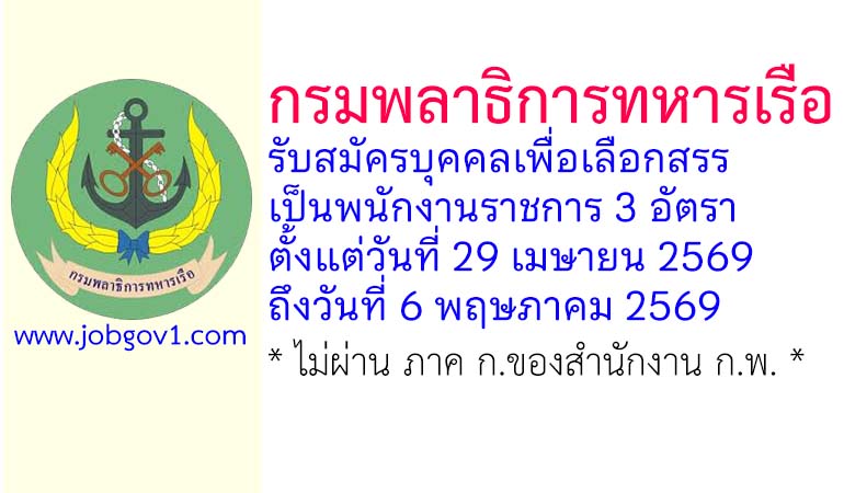 กรมพลาธิการทหารเรือ รับสมัครบุคคลเพื่อเลือกสรรเป็นพนักงานราชการ 3 อัตรา ตั้งแต่วันที่ 29 เมษายน 2569 ถึงวันที่ 6 พฤษภาคม 2569