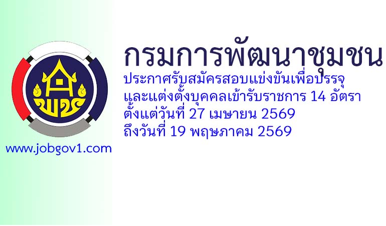 กรมการพัฒนาชุมชน รับสมัครสอบแข่งขันเพื่อบรรจุและแต่งตั้งบุคคลเข้ารับราชการ 14 อัตรา ตั้งแต่วันที่ 27 เมษายน 2569 ถึงวันที่ 19 พฤษภาคม 2569