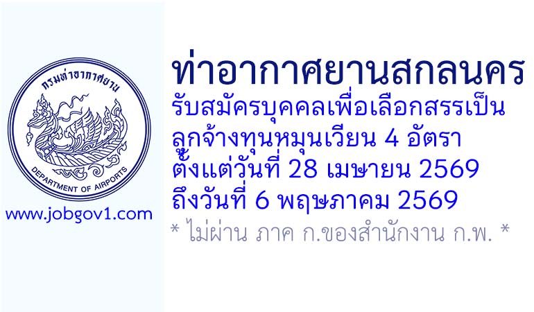 ท่าอากาศยานสกลนคร รับสมัครบุคคลเพื่อเลือกสรรเป็นลูกจ้างทุนหมุนเวียน 4 อัตรา ตั้งแต่วันที่ 28 เมษายน 2569 ถึงวันที่ 6 พฤษภาคม 2569