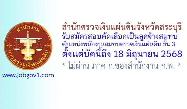 สำนักตรวจเงินแผ่นดินจังหวัดสระบุรี รับสมัครสอบคัดเลือกเป็นลูกจ้างสมทบ ตำแหน่งพนักงานสมทบตรวจเงินแผ่นดิน ชั้น 5 ตั้งแต่บัดนี้ถึง 7 มกราคม 2569
