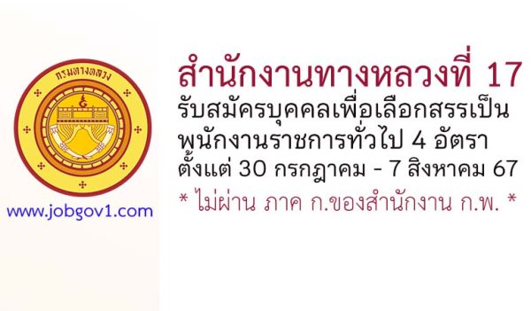 สำนักงานทางหลวงที่ 17 รับสมัครบุคคลเพื่อเลือกสรรเป็นพนักงานราชการทั่วไป 3 อัตรา ตั้งแต่วันที่ 11-19 ธันวาคม 2567