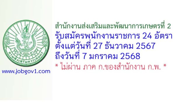 สำนักงานส่งเสริมและพัฒนาการเกษตรที่ 2 รับสมัครบุคคลเพื่อเลือกสรรเป็นพนักงานราชการทั่วไป 24 อัตรา ตั้งแต่วันที่ 27 ธันวาคม 2567 ถึงวันที่ 7 มกราคม 2568