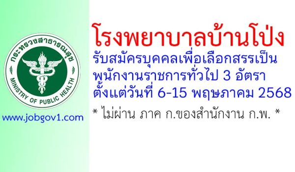โรงพยาบาลบ้านโป่ง รับสมัครบุคคลเพื่อเลือกสรรเป็นพนักงานราชการทั่วไป 3 อัตรา ตั้งแต่วันที่ 6-15 พฤษภาคม 2568