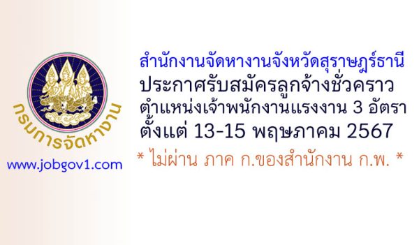 สำนักงานจัดหางานจังหวัดสุราษฎร์ธานี รับสมัครลูกจ้างชั่วคราว ตำแหน่งเจ้าพนักงานแรงงาน 3 อัตรา ตั้งแต่วันที่ 1-6 พฤษภาคม 2568