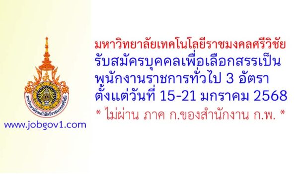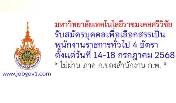 มหาวิทยาลัยเทคโนโลยีราชมงคลศรีวิชัย รับสมัครบุคคลเพื่อเลือกสรรเป็นพนักงานราชการทั่วไป 4 อัตรา ตั้งแต่วันที่ 14-18 กรกฎาคม 2568