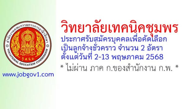 วิทยาลัยการอาชีพชุมพร รับสมัครลูกจ้างชั่วคราว 2 อัตรา ตั้งแต่บัดนี้ถึง 7 พฤศจิกายน 2568
