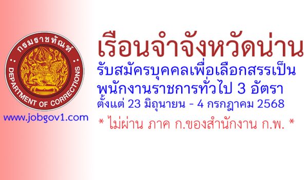 เรือนจำจังหวัดน่าน รับสมัครบุคคลเพื่อเลือกสรรเป็นพนักงานราชการทั่วไป 3 อัตรา ตั้งแต่ 23 มิถุนายน – 4 กรกฎาคม 2568