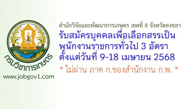 สำนักวิจัยและพัฒนาการเกษตร เขตที่ 8 จังหวัดสงขลา รับสมัครบุคคลเพื่อเลือกสรรเป็นพนักงานราชการทั่วไป 3 อัตรา ตั้งแต่วันที่ 9-18 เมษายน 2568