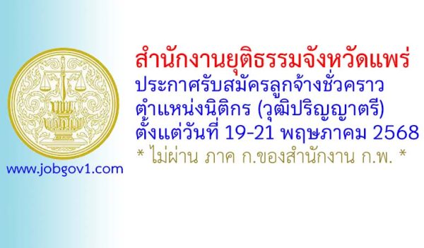 สำนักงานยุติธรรมจังหวัดแพร่ รับสมัครลูกจ้างชั่วคราว ตำแหน่งนิติกร (วุฒิปริญญาตรี) ตั้งแต่วันที่ 19-21 พฤษภาคม 2568