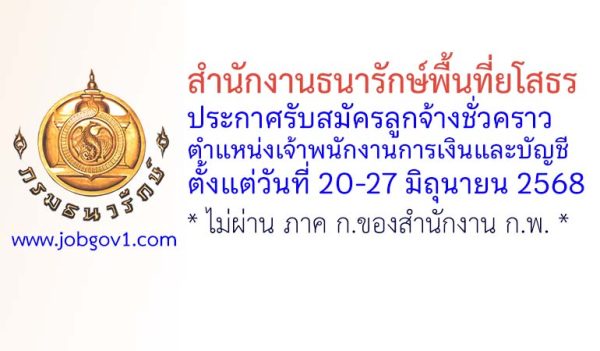 สำนักงานธนารักษ์พื้นที่ยโสธร รับสมัครลูกจ้างชั่วคราว ตำแหน่งเจ้าพนักงานการเงินและบัญชี ตั้งแต่วันที่ 20-27 มิถุนายน 2568
