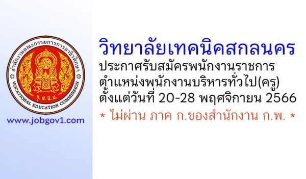 วิทยาลัยเทคนิคสกลนคร รับสมัครพนักงานราชการทั่วไป ตำแหน่งพนักงานบริหารทั่วไป (ครู) กลุ่มสาขาวิชาช่างยนต์ ตั้งแต่วันที่ 3-14 พฤศจิกายน 2568