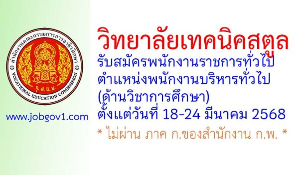 วิทยาลัยเทคนิคสตูล รับสมัครพนักงานราชการทั่วไป ตำแหน่งพนักงานบริหารทั่วไป (ด้านวิชาการศึกษา) ตั้งแต่วันที่ 18-24 มีนาคม 2568