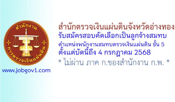 สำนักตรวจเงินแผ่นดินจังหวัดอ่างทอง รับสมัครสอบคัดเลือกเป็นลูกจ้างสมทบ ตำแหน่งพนักงานสมทบตรวจเงินแผ่นดิน ชั้น 5 ตั้งแต่บัดนี้ถึง 4 กรกฎาคม 2568