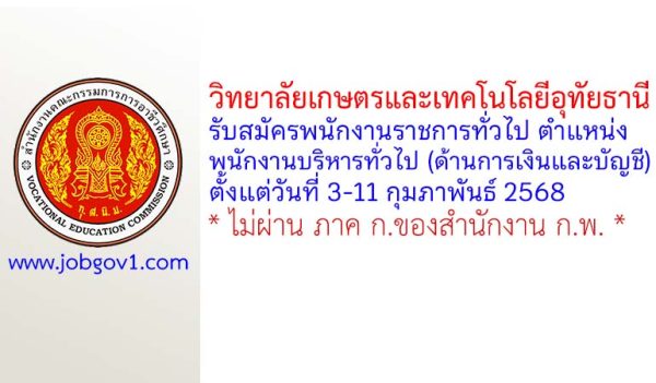 วิทยาลัยเกษตรและเทคโนโลยีอุทัยธานี รับสมัครพนักงานราชการทั่วไป ตำแหน่งพนักงานบริหารทั่วไป (ด้านการเงินและบัญชี) ตั้งแต่วันที่ 3-11 กุมภาพันธ์ 2568