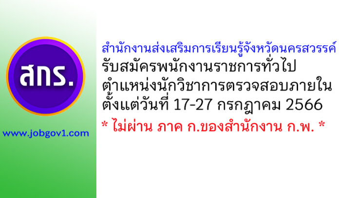 สำนักงานส่งเสริมการเรียนรู้จังหวัดนครสวรรค์ รับสมัครพนักงานราชการทั่วไป ตำแหน่งนักวิชาการตรวจสอบภายใน ตั้งแต่วันที่ 17-27 กรกฎาคม 2566