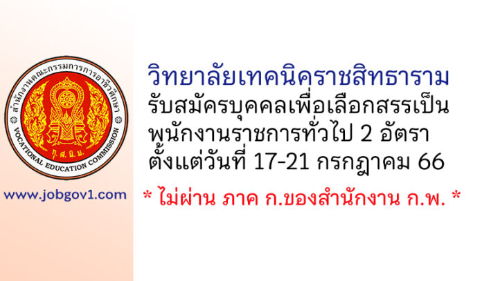 วิทยาลัยเทคนิคราชสิทธาราม รับสมัครบุคคลเพื่อเลือกสรรเป็นพนักงานราชการทั่วไป 2 อัตรา ตั้งแต่วันที่ 17-21 กรกฎาคม 2566