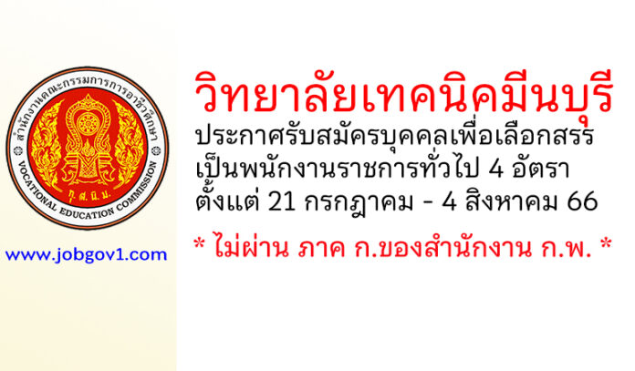 วิทยาลัยเทคนิคมีนบุรี รับสมัครบุคคลเพื่อเลือกสรรเป็นพนักงานราชการทั่วไป 4 อัตรา ตั้งแต่ 21 กรกฎาคม – 4 สิงหาคม 2566