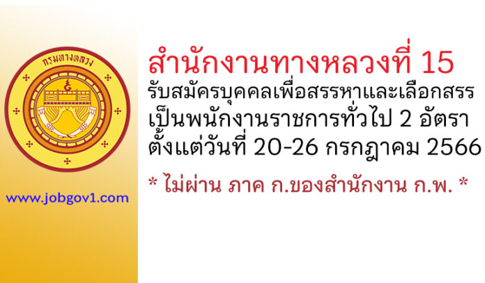 สำนักงานทางหลวงที่ 15 รับสมัครบุคคลเพื่อสรรหาและเลือกสรรเป็นพนักงานราชการทั่วไป 2 อัตรา ตั้งแต่วันที่ 20-26 กรกฎาคม 2566