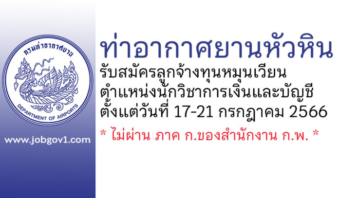 ด้วยท่าอากาศยานหัวหิน มีความประสงค์จะดำเนินการสรรหาและเลือกสรรลูกจ้างทุนหมุนเวียน ในตำแหน่งนักวิชาการเงินและบัญชี ปฏิบัติงานที่ท่าอากาศยานหัวหิน โดยวิธีการรับสมัครบุคคลเพื่อพิจารณา คุณสมบัติเฉพาะ (สอบสัมภาษณ์) และจัดจ้างเป็นลูกจ้างทุนหมุนเวียนกรมท่าอากาศยาน ตำแหน่งนักวิชาการเงิน และบัญชี จำนวน 1 อัตรา