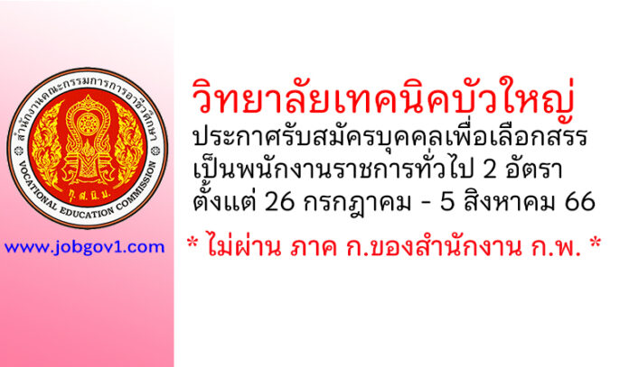 วิทยาลัยเทคนิคบัวใหญ่ รับสมัครบุคคลเพื่อเลือกสรรเป็นพนักงานราชการทั่วไป 2 อัตรา ตั้งแต่ 26 กรกฎาคม – 5 สิงหาคม 2566