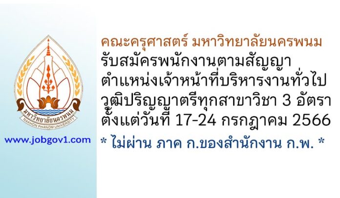 คณะครุศาสตร์ มหาวิทยาลัยนครพนม รับสมัครพนักงานตามสัญญา ตำแหน่งเจ้าหน้าที่บริหารงานทั่วไป 3 อัตรา ตั้งแต่วันที่ 17-24 กรกฎาคม 2566