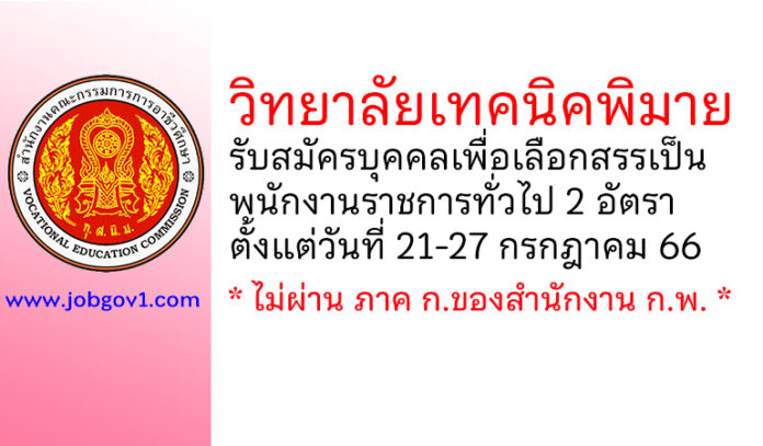 วิทยาลัยเทคนิคพิมาย รับสมัครบุคคลเพื่อเลือกสรรเป็นพนักงานราชการทั่วไป 2 อัตรา ตั้งแต่วันที่ 21-27 กรกฎาคม 2566