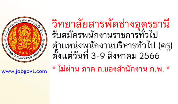 วิทยาลัยสารพัดช่างอุดรธานี รับสมัครพนักงานราชการทั่วไป ตำแหน่งพนักงานบริหารทั่วไป (ครู) ตั้งแต่วันที่ 3-9 สิงหาคม 2566