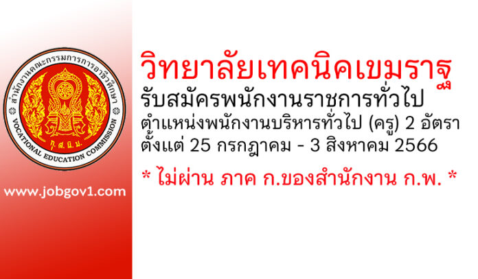 วิทยาลัยเทคนิคเขมราฐ รับสมัครพนักงานราชการทั่วไป ตำแหน่งพนักงานบริหารทั่วไป (ครู) 2 อัตรา ตั้งแต่ 25 กรกฎาคม – 3 สิงหาคม 2566