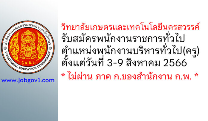 วิทยาลัยเกษตรและเทคโนโลยีนครสวรรค์ รับสมัครพนักงานราชการทั่วไป ตำแหน่งพนักงานบริหารทั่วไป(ครู) ตั้งแต่วันที่ 3-9 สิงหาคม 2566
