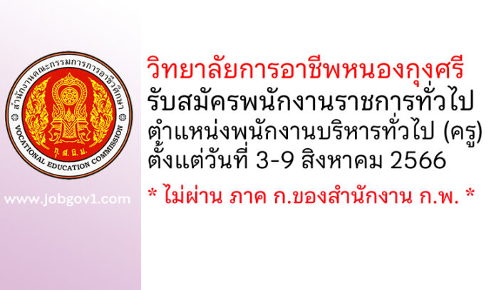 วิทยาลัยการอาชีพหนองกุงศรี รับสมัครพนักงานราชการทั่วไป ตำแหน่งพนักงานบริหารทั่วไป (ครู) ตั้งแต่วันที่ 3-9 สิงหาคม 2566