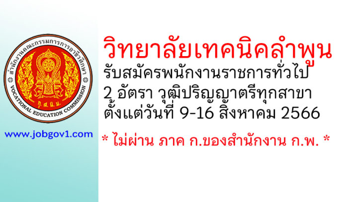 วิทยาลัยเทคนิคลำพูน รับสมัครบุคคลเพื่อเลือกสรรเป็นพนักงานราชการทั่วไป 2 อัตรา ตั้งแต่วันที่ 9-16 สิงหาคม 2566