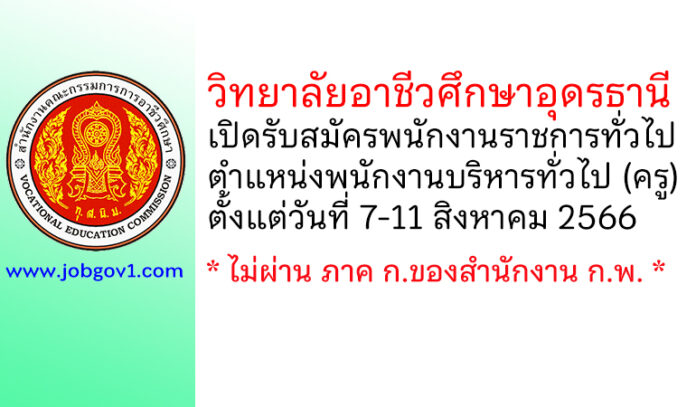 วิทยาลัยอาชีวศึกษาอุดรธานี รับสมัครพนักงานราชการทั่วไป ตำแหน่งพนักงานบริหารทั่วไป (ครู) ตั้งแต่วันที่ 7-11 สิงหาคม 2566