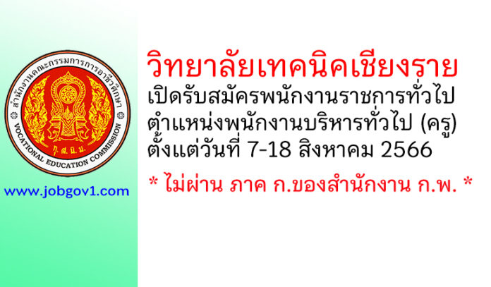 วิทยาลัยเทคนิคเชียงราย รับสมัครพนักงานราชการทั่วไป ตำแหน่งพนักงานบริหารทั่วไป (ครู) ตั้งแต่วันที่ 7-18 สิงหาคม 2566