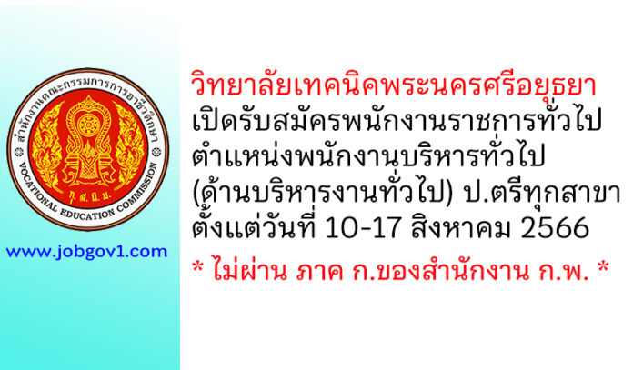 วิทยาลัยเทคนิคพระนครศรีอยุธยา รับสมัครพนักงานราชการทั่วไป ตำแหน่งพนักงานบริหารทั่วไป (ด้านบริหารงานทั่วไป) ตั้งแต่วันที่ 10-17 สิงหาคม 2566