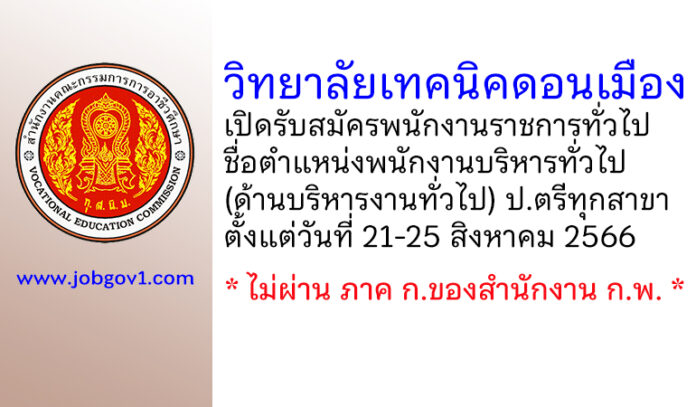 วิทยาลัยเทคนิคดอนเมือง รับสมัครพนักงานราชการทั่วไป ตำแหน่งพนักงานบริหารงานทั่วไป (ด้านบริหารงานทั่วไป) ตั้งแต่วันที่ 21-25 สิงหาคม 2566