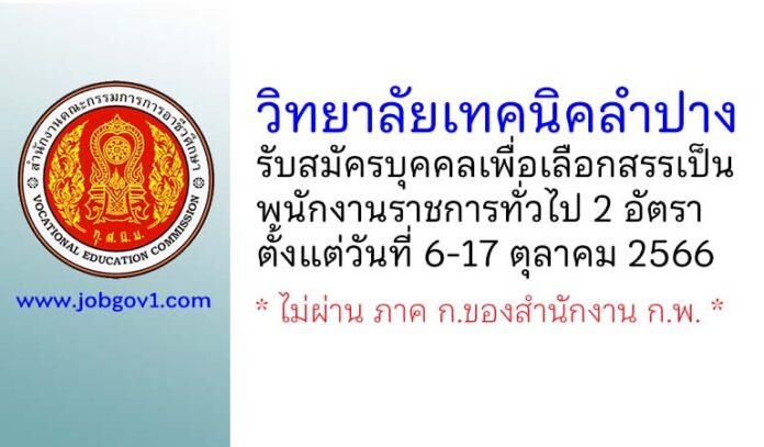 วิทยาลัยเทคนิคลำปาง รับสมัครบุคคลเพื่อเลือกสรรเป็นพนักงานราชการทั่วไป 2 อัตรา ตั้งแต่วันที่ 6-17 ตุลาคม 2566