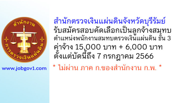 สำนักตรวจเงินแผ่นดินจังหวัดบุรีรัมย์ รับสมัครสอบคัดเลือกเป็นลูกจ้างสมทบ ตำแหน่งพนักงานสมทบตรวจเงินแผ่นดิน ชั้น 3 ตั้งแต่บัดนี้ถึง 7 กรกฎาคม 2566